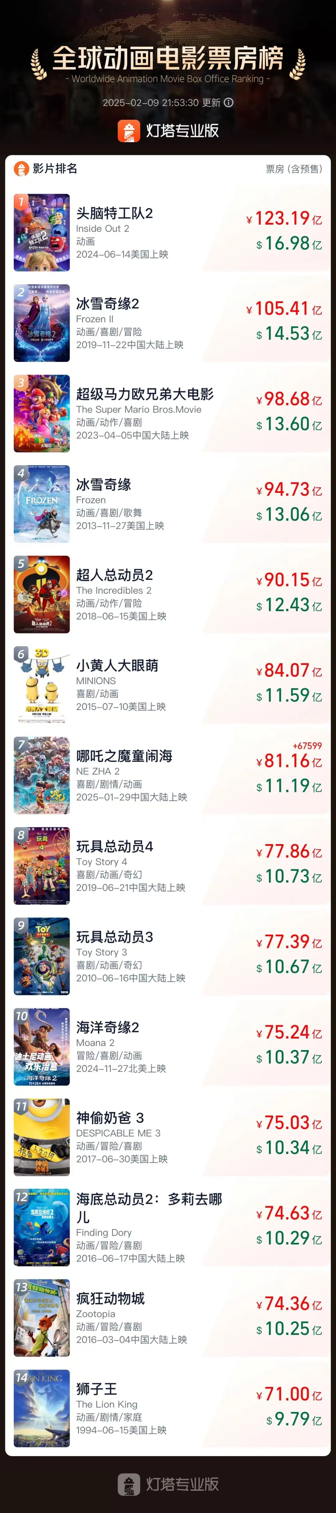 目前,《哪吒2》电影票房已超过《玩具总动员3》和《玩具总动员4》票房成绩,位列全球动画片票房榜第7名,同时也是首部进入全球动画票房榜TOP10的非好莱坞动画电影。