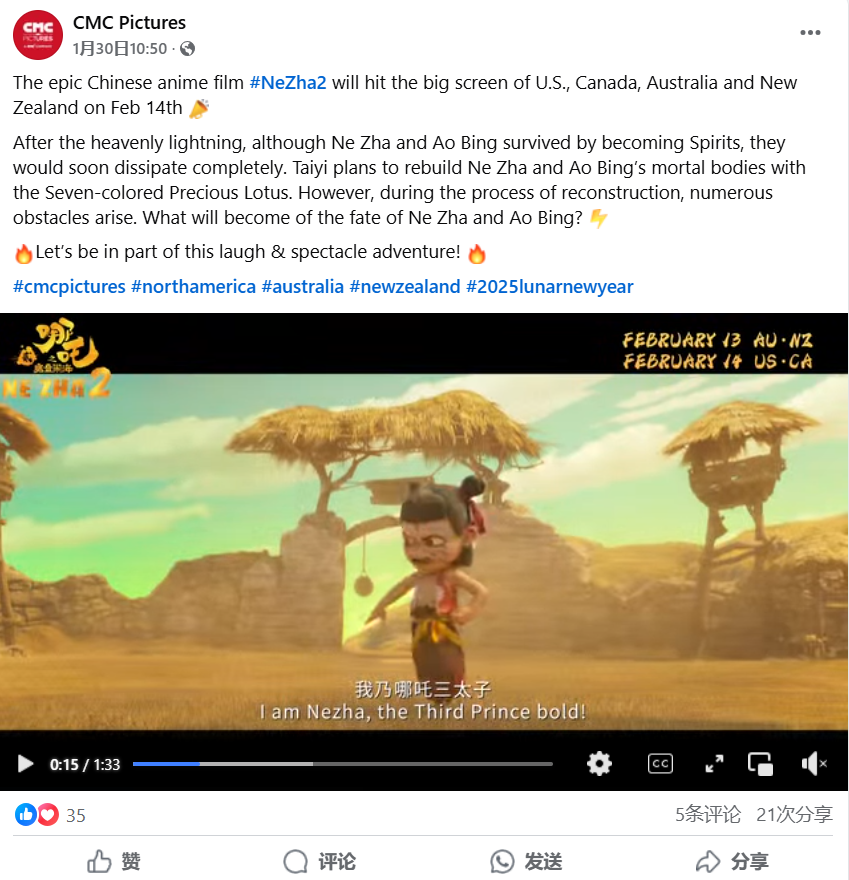 1月30日,根据中国电影海外发行平台中国电影业在脸书平台上发布的消息,电影《哪吒的魔童闹海》(哪吒2)将于2月14日在美国、加拿大等地正式上映。