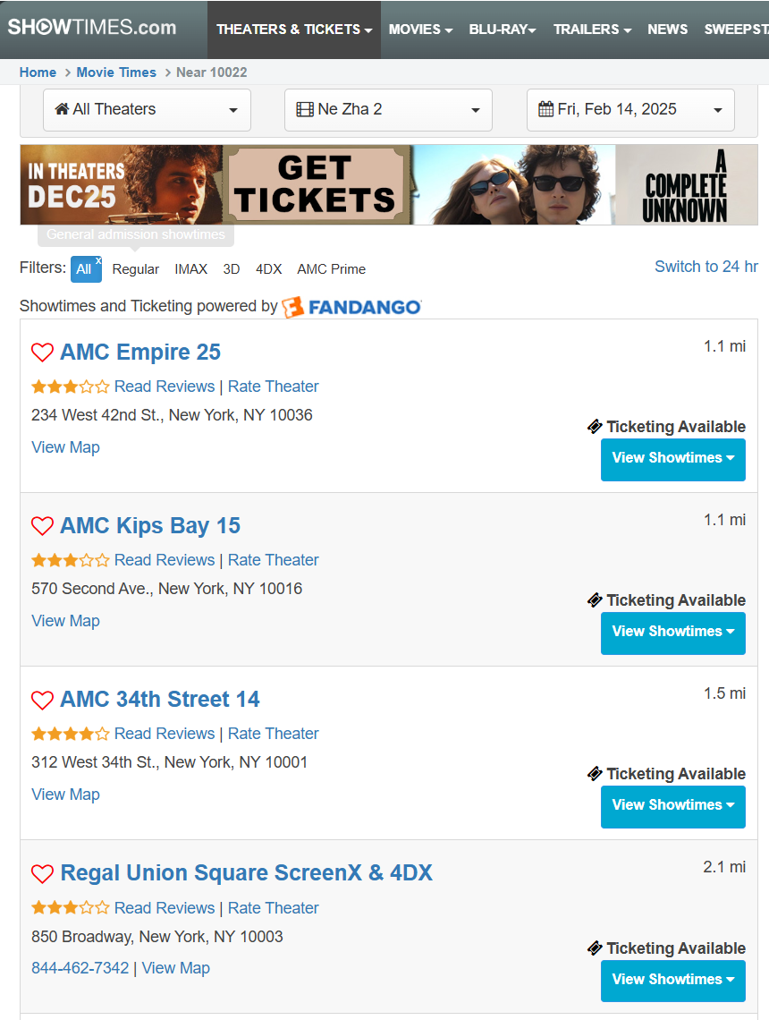 现在,与《哪吒2》相关的售票信息仍然可以在Showtimes等票务网站上找到。