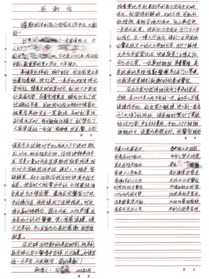 后来,田某来到警察单位发了一封感谢信,对他表示了深深的感谢:“感谢你的及时帮助,如果不是大家及时介入,以后还有很多保费要扣,我不知道该怎么办。在你的帮助下,我不仅帮助我的血汗钱“完美归赵”,还让我在除夕夜感到温暖和安心!”