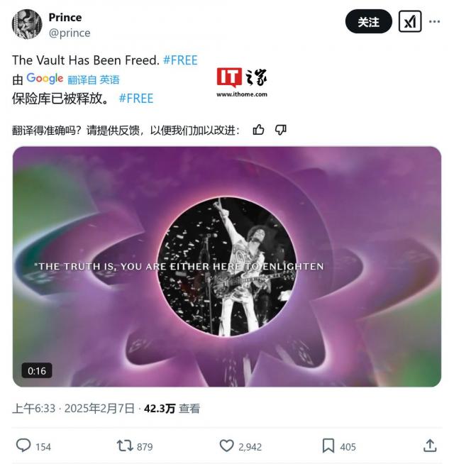 Prince 官方 X 账号发布消息称“财产已经释放”,引用了“无论如何,没有人能向别人规定你是谁”和“事实是,你要么来启发,要么来劝阻”等语录。