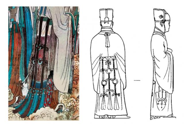 挂在腰部通常是一种装饰功能,但也有特殊的礼仪特征,例如组合礼服时会选择比较复杂的礼服。绶带,或者佩戴印章,是具有一定身份的人在重大礼仪场景中会使用的配件,如朝服、祭拜服等。,通常由多个灌浆草结连接使用。