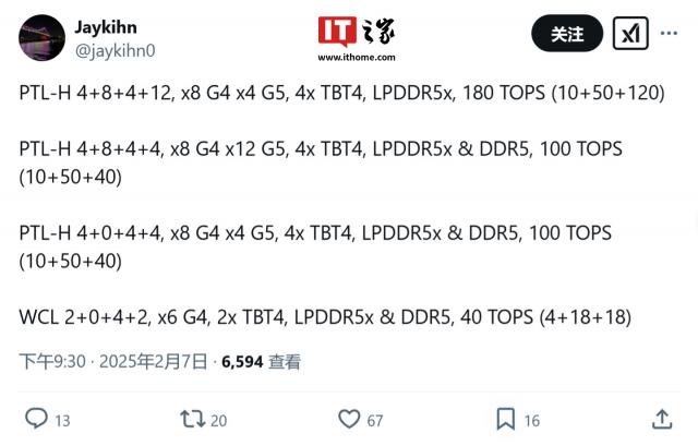 Panther Lake-H 这个系列至少有三个 SKU,将采用顶级型号 4 个 P-core(性能核心)、8 个 E-core(效率核心)和 4 个 LPE core(低功耗 E-core),组合基于 Celestial 架构的 12 Xe3 iGPU,支持 LPDDR5X 内存,平台的最终能力已经达到 180 TOPS。
