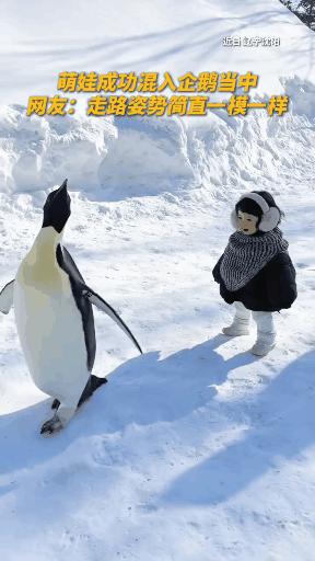 萌娃化身 Q 企鹅混入企鹅团队的版本:最近,辽宁沈阳,萌娃跟着企鹅学走路,一走一摆都很可爱。网民:不能说非常相似,只能说完全一样。