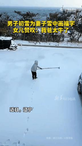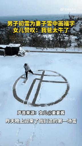 接福!男子初雪为妻子雪中画福字:最近辽宁,初雪过后,男人用铲子在雪地里给妻子画了一个“福”字。据女儿说,他答应在立冬给妻子写一个“福”字。