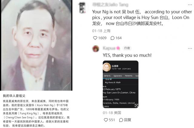 就像下面这位在美国夏威夷的博主一样,只知道曾祖父。 吴国华 他说:“出生于广东,后移民夏威夷,对其他方面了解不多。