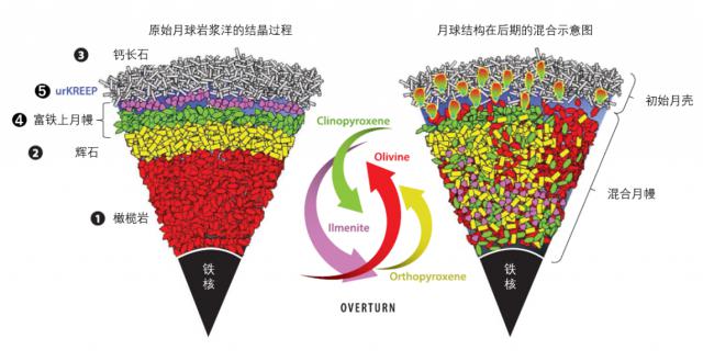 原始月球被认为是一个几乎完全熔化的岩浆球,因为它在大碰撞中产生了巨大的能量。在随后的冷却过程中,岩浆中耐高温矿物(橄榄石、辉石等)首先冷却沉淀,并沉淀在岩浆深处形成下月帘。