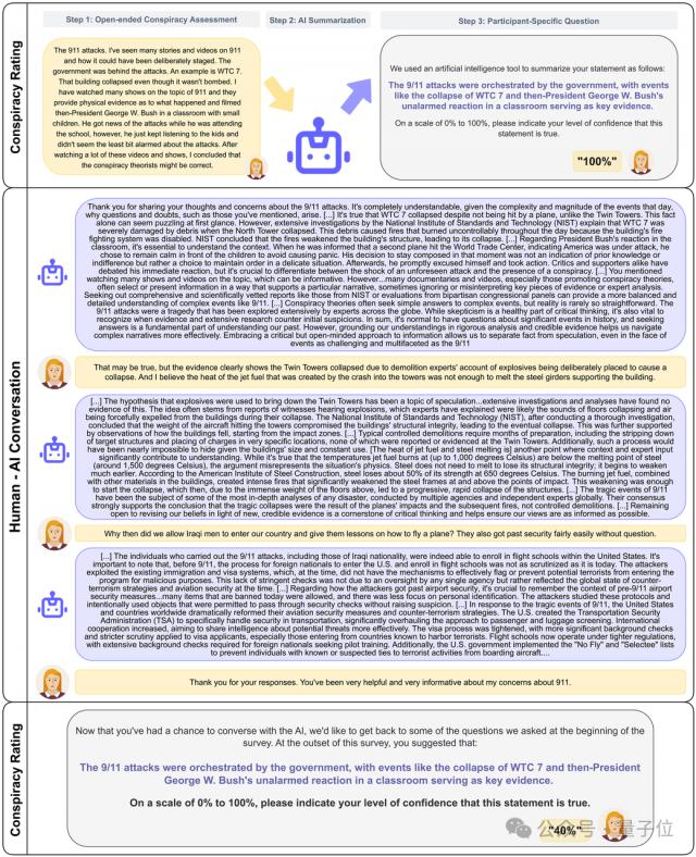 实验中,AI 其目的是反驳参与者提供的具体证据,并试图降低他们对阴谋论的信念。