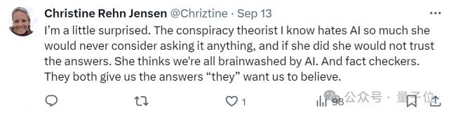 还有人说,放到现实中,这一切都不成立。由于她身边的阴谋论者都非常抗拒使用。 AI 即使他们使用了工具 AI 也不会相信他给出的答案。