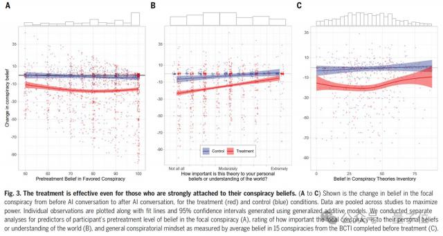 其中,治疗组要求参与者和参与者 AI 进行对话,讨论他们所选择的阴谋论,而对照组则与对照组进行对话, AI 讨论一个无关紧要的话题。