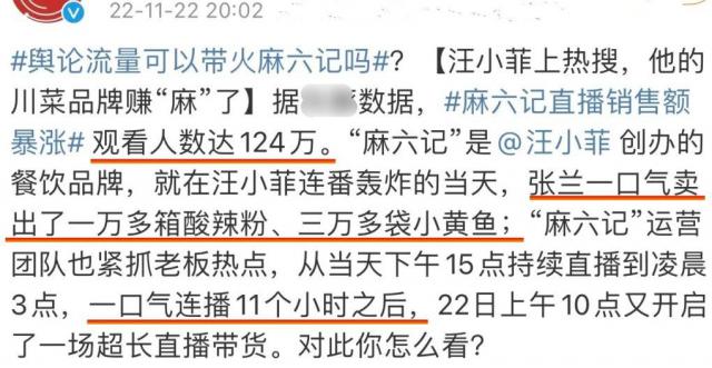 接着,汪小菲连番轰炸。 S 家里,张兰当天卖了一万多箱酸辣粉和三万多袋小黄鱼。麻六记运营团队紧随其后,从下午3:00到凌晨3:00,第二天早上10:00开始播出,直播一天。 5 场。