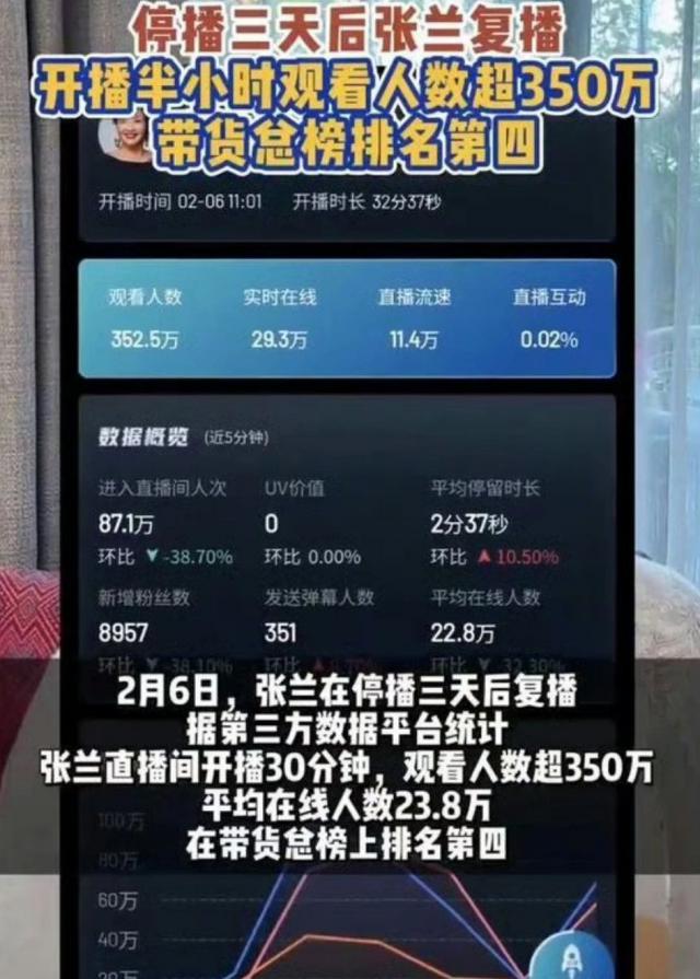 播出半小时后,直播间人数超过 350 万,平均在线人数达到 23.8 万。