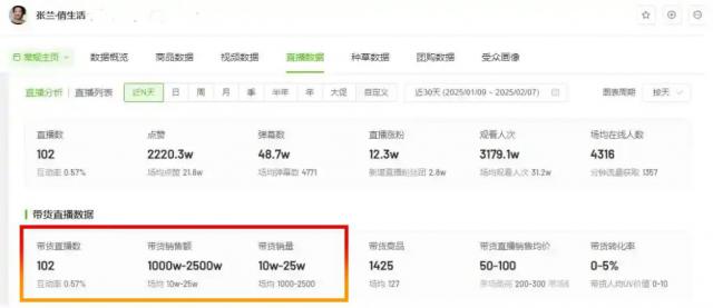数据显示,近 30 天啊,张兰账号共直播 102 市场,带货销售 10~25 一万元,带货销售额1000~2500 万元。