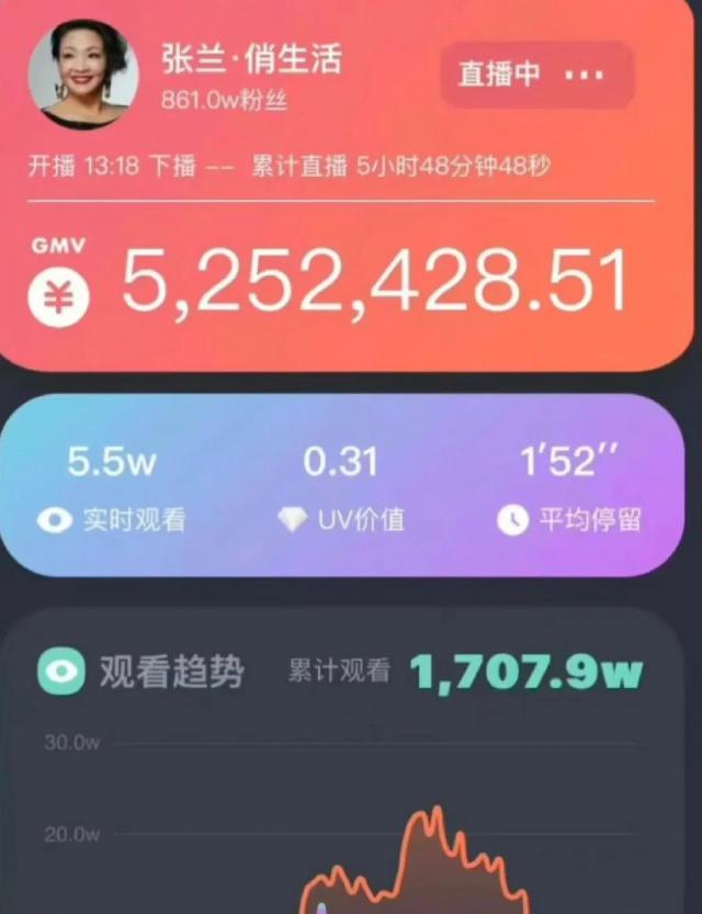 当天,张兰连续5小时48分钟直播,销售额直接破产。525 万。