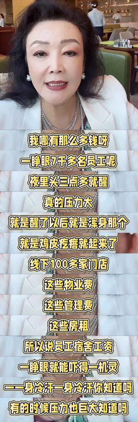 她说她没有那么多钱,甚至每天都会想到全国各地商店的物业费、租金、 7000 许多员工的租金和工资,这些固定费用,总是在晚上三点钟醒来。