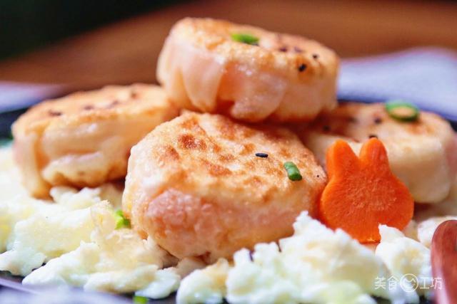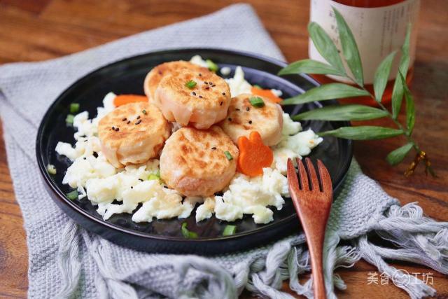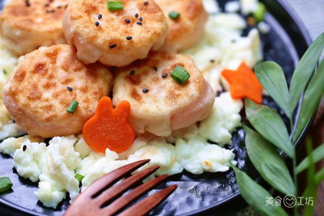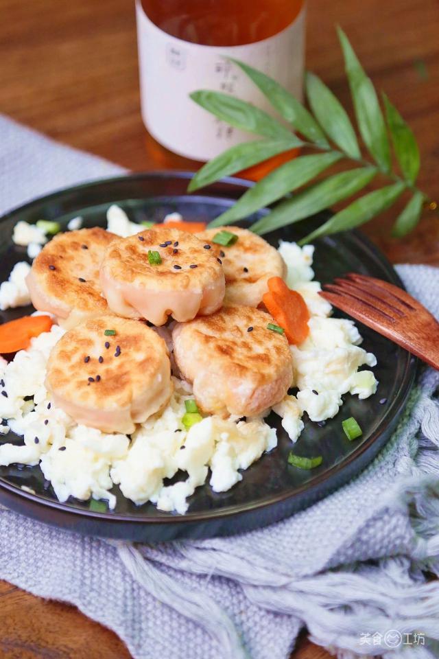 9. 炒好的蛋清垫底,再放上煎好的蛋黄流心包。