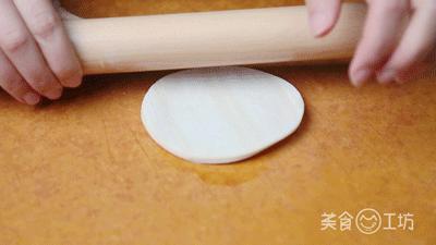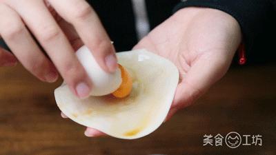 6. 用包子的方法把蛋黄包进饺子皮里。