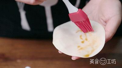 1. 取一个饺子皮,表面刷一层薄薄的油,覆盖另一个饺子皮,重复操作。