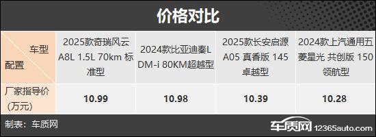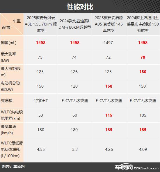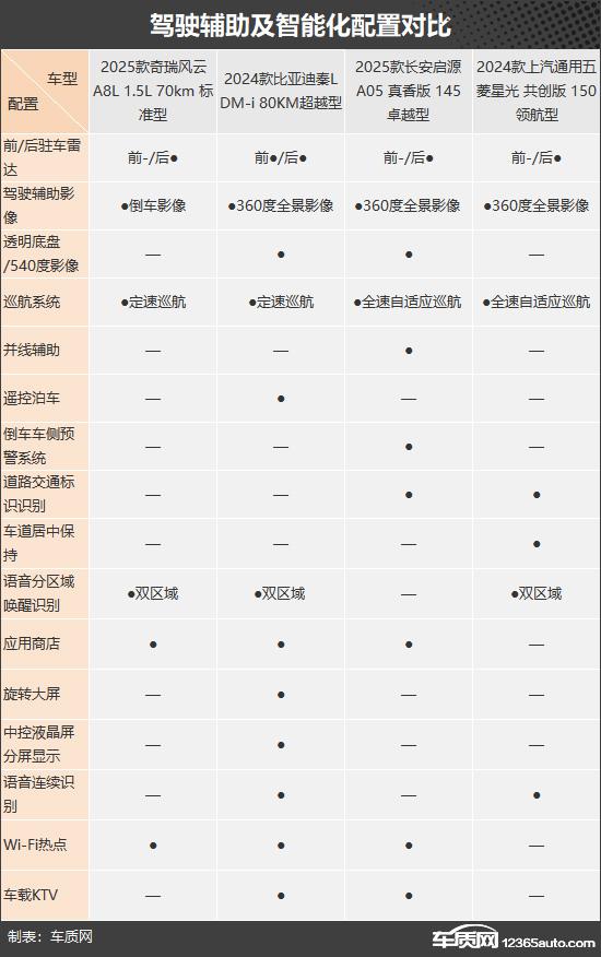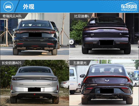 我们这次推荐的四款车分别是 2025 款奇瑞风云 A8L 1.5L 70km 基本类型(以下简称:奇瑞风云 A8L)、2024 款比亚迪秦 L DM-i 80KM 超越型(以下简称:比亚迪秦 L)、2025 款长安启源 A05 好香版 145 优秀型(以下简称:长安启源 A05)和 2024 上汽通用五菱星光 同创版 150 领航型(以下简称五菱星光)。虽然四款车型的等级不同,但车身长度接近厂家的指导价,能源类型都是插电式混合动力(因为现在照片数量少,有些车型的照片不是相应的具体款式)。