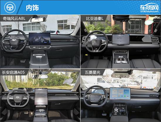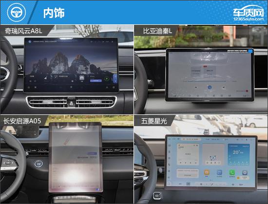 对新能源车型而言,内部中控台大屏已成为必备配置,否则会使人感觉跟不上时代潮流。这次推荐的四款车都配备了大尺寸的中控面板,但是设计形式不同;其中,长安启源 A05 中央控制屏采用纵向设计,屏幕尺寸为 13.2 英尺,视觉冲击力强。比亚迪秦 L 选择家族化的可旋转中控屏幕,可玩性更强。相比之下,奇瑞风云 A8L 而且五菱星光的横放式中控面板设计让人感觉略显平凡。
