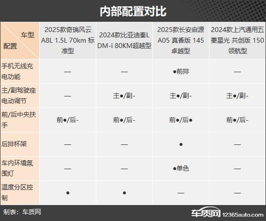 在内部配置方面,长安启源 A05 性能显著,在舒适性和便捷性配置上更有优势,如前排手机的无线充电功能、后中央扶手、后杯架、纯色车内环境灯等,可以带来更好的用车体验。相比之下,奇瑞风云 A8L 内部配置略逊一筹,是四款车中唯一一款没有配置主驾驶座电动调节车型。