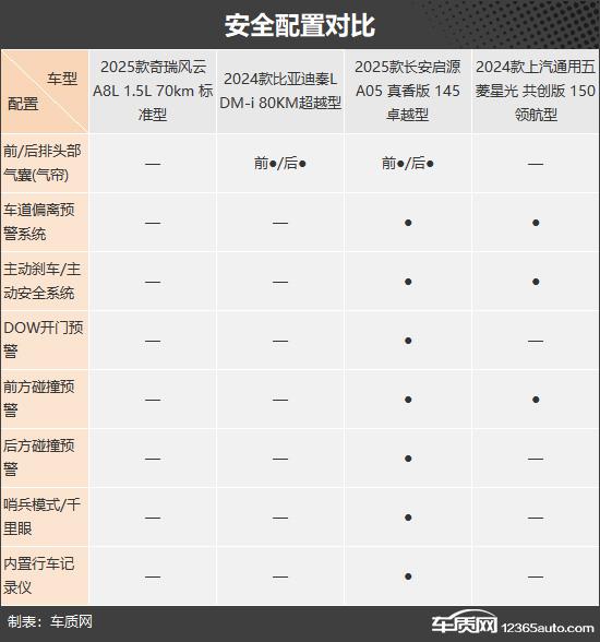 在安全配置方面,长安启源 A05 与其它三款车型相比,优势明显,独享 DOW 开门预警,后方碰撞预警,哨兵模式 / 千里眼,内置行车记录仪。相比之下,奇瑞风云 A8L 表现最差,在主动安全和被动安全配置方面缺失较多,例如在配置之前 / 后排头部气囊 ( 气帘 ) 、车道偏离预警系统和主动刹车 / 主动性安全系统等。