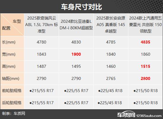 虽然四款车的定位不同,但在车身长度上差别不大。其中,位于中型车的五菱星光在车身长度、高度和轴距上占据优势;比亚迪秦 L 车身宽度性能突出,车内横向空间更好。另外,长安启源 A05 还配有五菱星光 18 英尺轮毂,视觉效果更显大气。