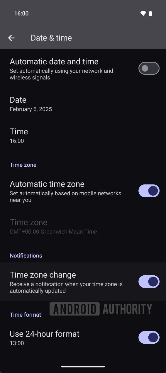 在深入研究 Android 16 Beta 1 版本时,AndroidAuthority 发现了一些与新“时区变更”功能相关的代码字符串,这个功能估计会出现在设置中。 > 系统 > 菜单下的日期和时间。描述说,该功能使用户能够“在时区自动更新时收到通知”。