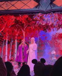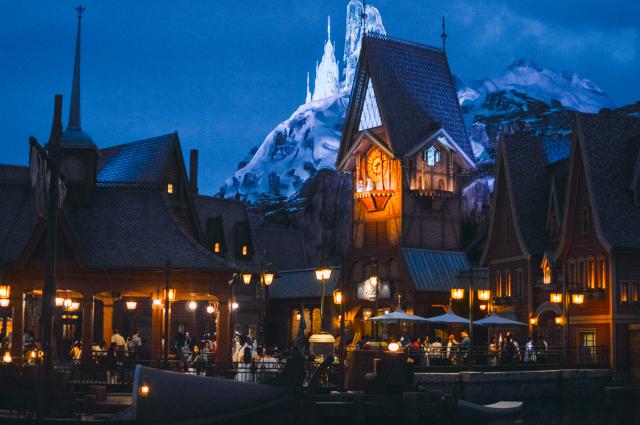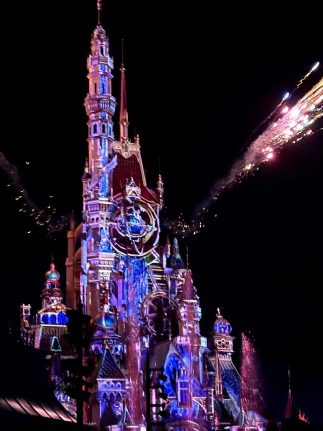 因为这次我们来了冰雪奇缘,晚上又回来刷了一遍。晚上的感觉也很棒,因为城堡会在晚上到达。 - 入夜 - 夜晚三个时间变换不同的颜色,艾莎的冰雪传奇会随着夜晚变得更加冰蓝,更加梦幻。