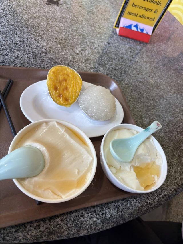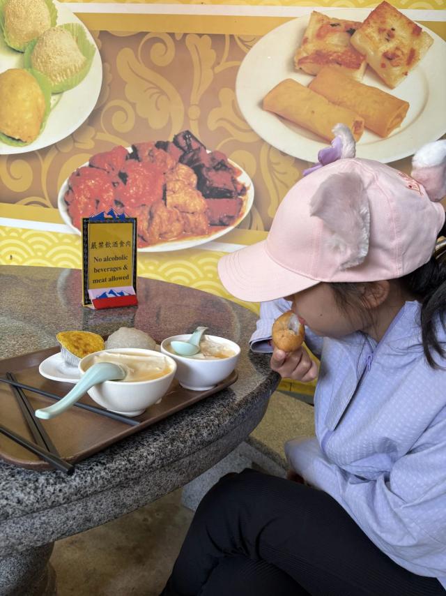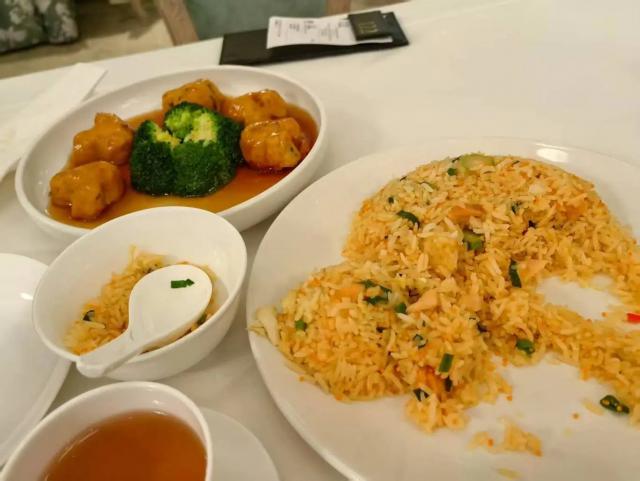 虾煮豆腐,三文鱼海鲜炒饭配普洱茶,量大,口感极佳,环境舒适,虽然 599 港元有点贵,但是比公园里的快餐要好得多。