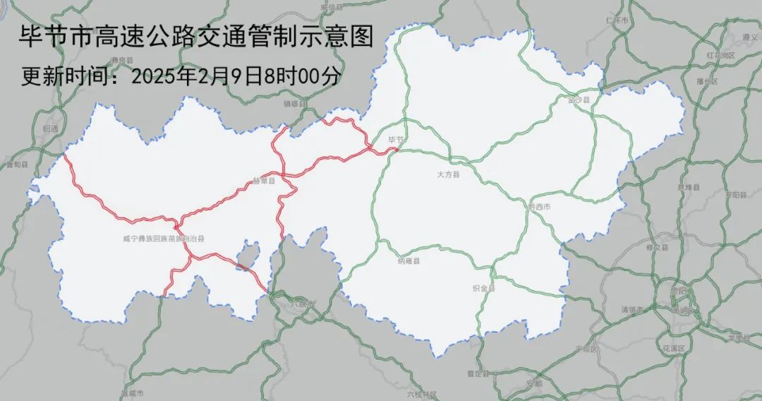 2月9日8时,厦蓉高速毕节(K1653)至生机(K1724)段双向、厦蓉高速纳雍(K1563)至龙场互通(K1602)段双向、杭瑞高速南互通(K1800)至以角(K1877)段双向交通(K1602)段双向、杭瑞高速南互通(K1800)至以角(K1877)段双向交通(K1602)。