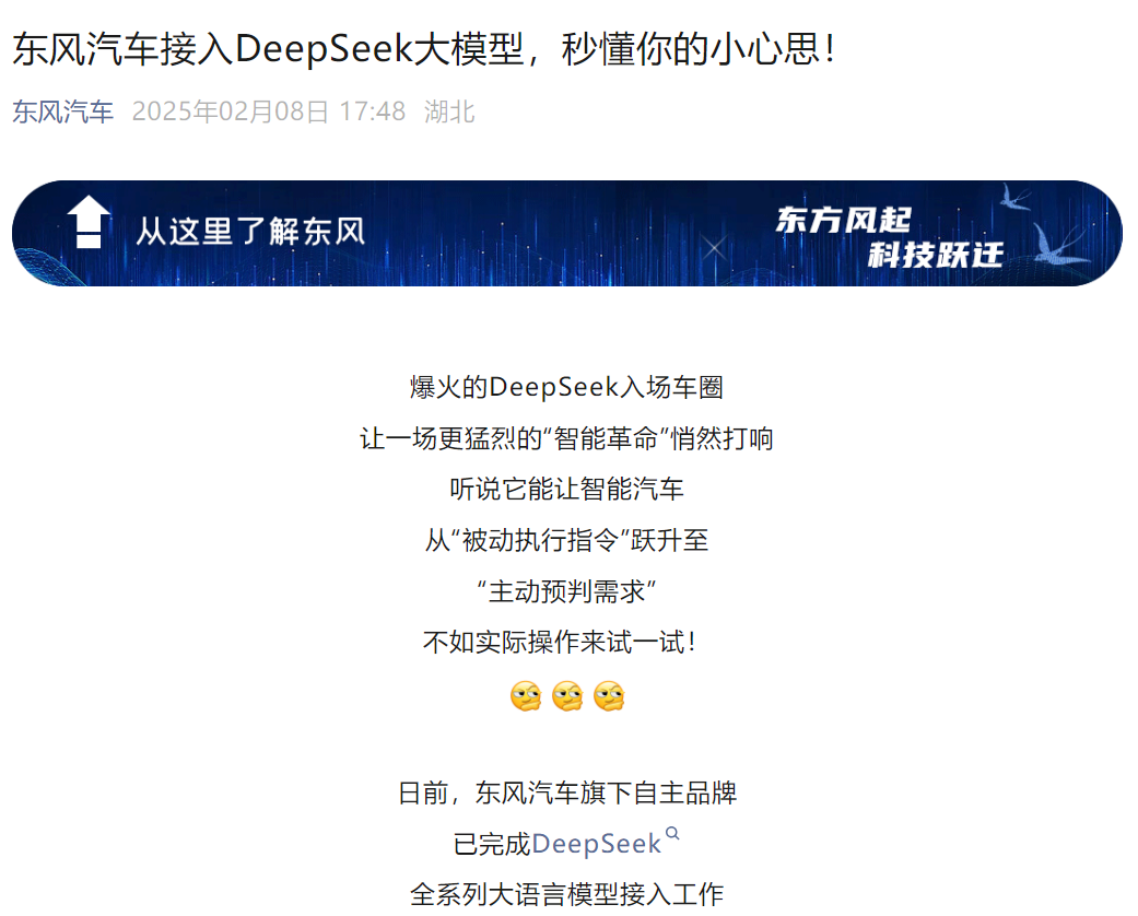 2月8日,东风汽车宣布,近日,公司自有品牌已完成DeepSeek全系列大语言模型接入工作,近期将在东风岚图、东风猛士、东风奕派、东风沈峰、东风纳米等公司自主品牌车型中应用。