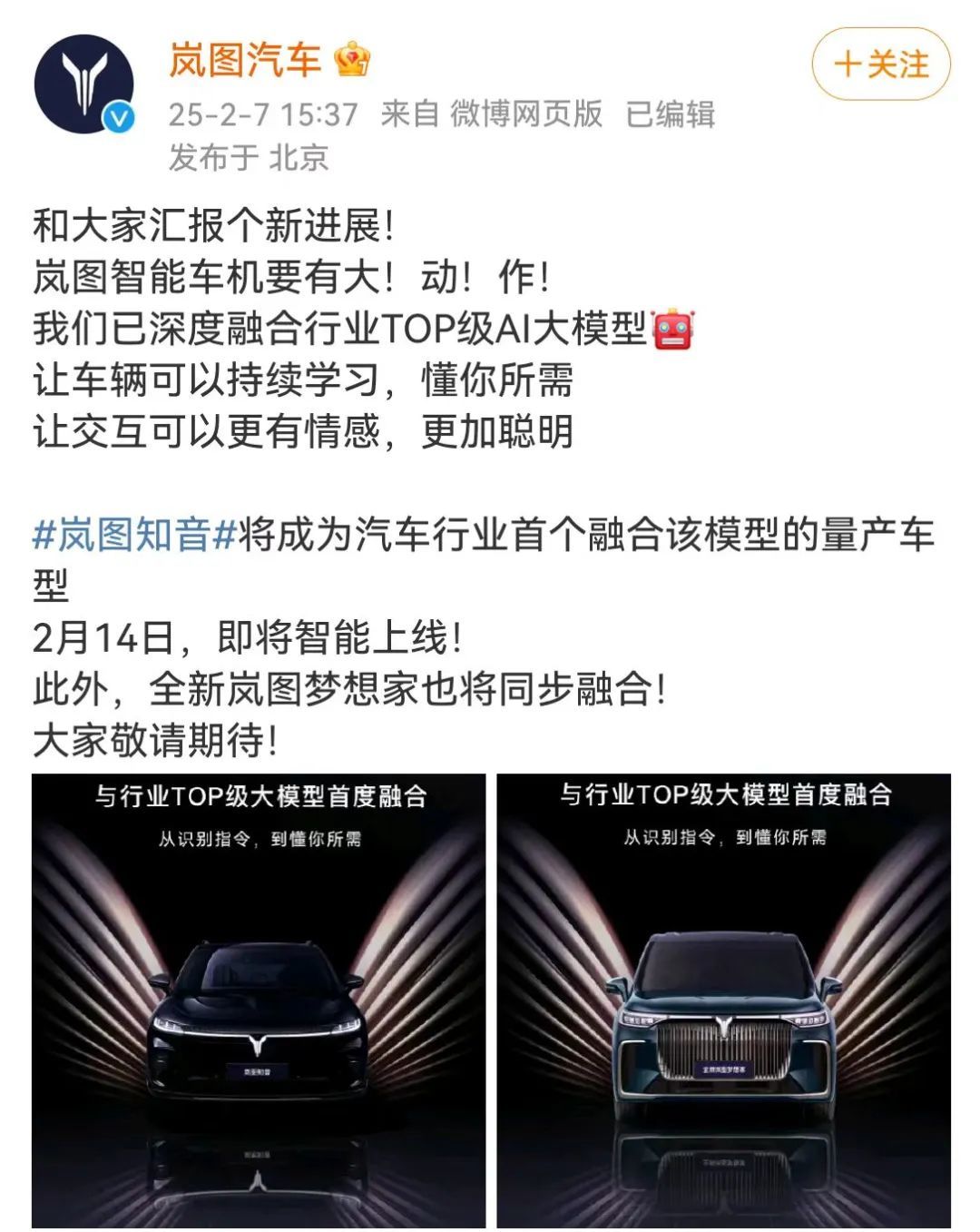 具体来说,岚图逍遥驾驶舱已经完成了DeepSeek全系列模型的布局。自2月7日起,东风岚图启动与DeepSeek模型逐渐紧密结合,岚图知音将成为汽车行业第一款结合DeepSeek的量产车型。