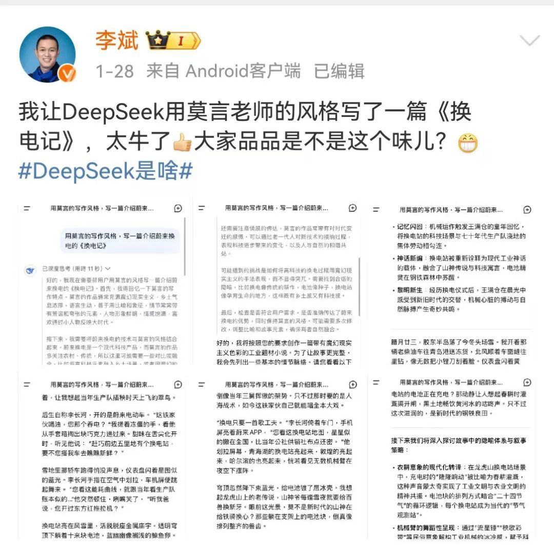 一月二十八日,李斌发布了一条微博,称他要求DeepSeek以莫言的写作风格写一篇《换电记》。在完成作品后,DeepSeek赞叹道:“太牛逼了”。