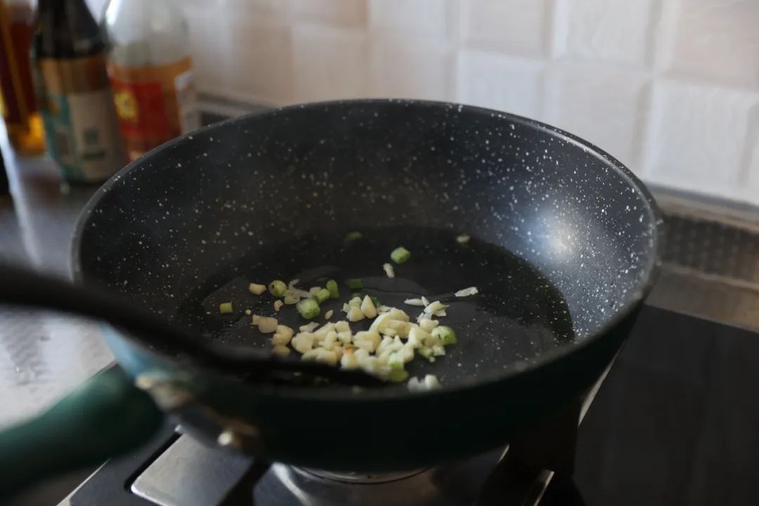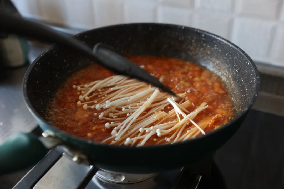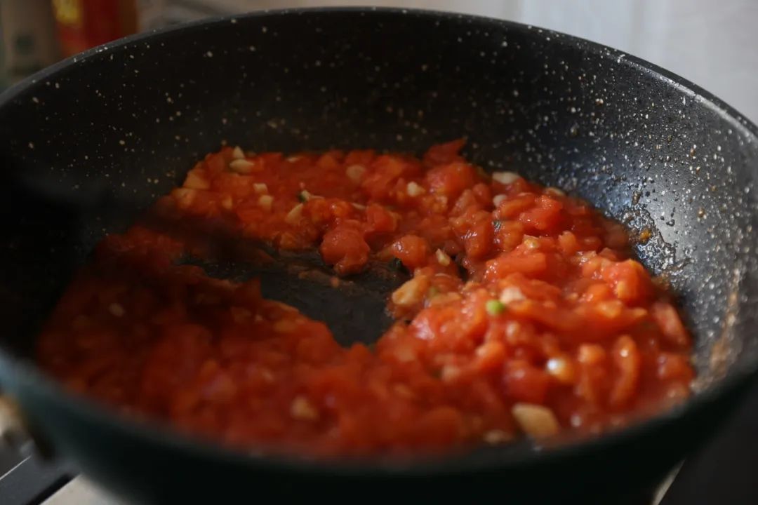 将薄油蒜末炒香,加入番茄碎,待炒成沙子后加水烧开,在高温影响下番茄开始释放酸甜番茄汁,这是汤底的关键。