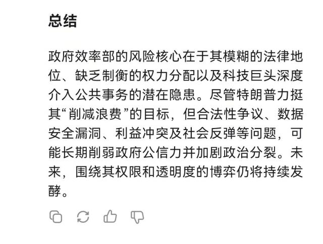 而且我也把“政府效率部”的风险抛给了我。 DeepSeek,下面这段话就是它给出的总结。