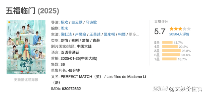 虽然芒果TV推出了为春节档量身定做的“五福临门”,但是5.7的豆瓣评分也注定了它难以实现口碑发醇。《墨雨云》成功后,于正试图通过“短剧化”再次进入下一个城市,但他证明了自己没有能力控制多部群像剧。五对CP的交叉呈现让剧情分散弹跳,让观众很难沉浸其中。在《五福临门》的热播期,云集的平均落点只有2000多万,这也暴露出芒果电视剧的基本板块并不牢固,还处于“剧带平台”而不是“平台带剧”的时期。