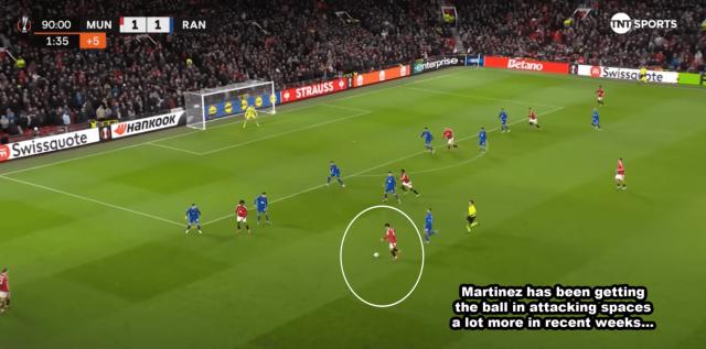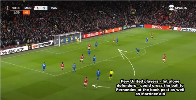 他的传中准确地找到了后点队友布鲁诺。 · 很少有曼联球员能做到费尔南德斯,包括只剩下两个边锋加纳乔和阿马德斯。 · 迪亚洛。