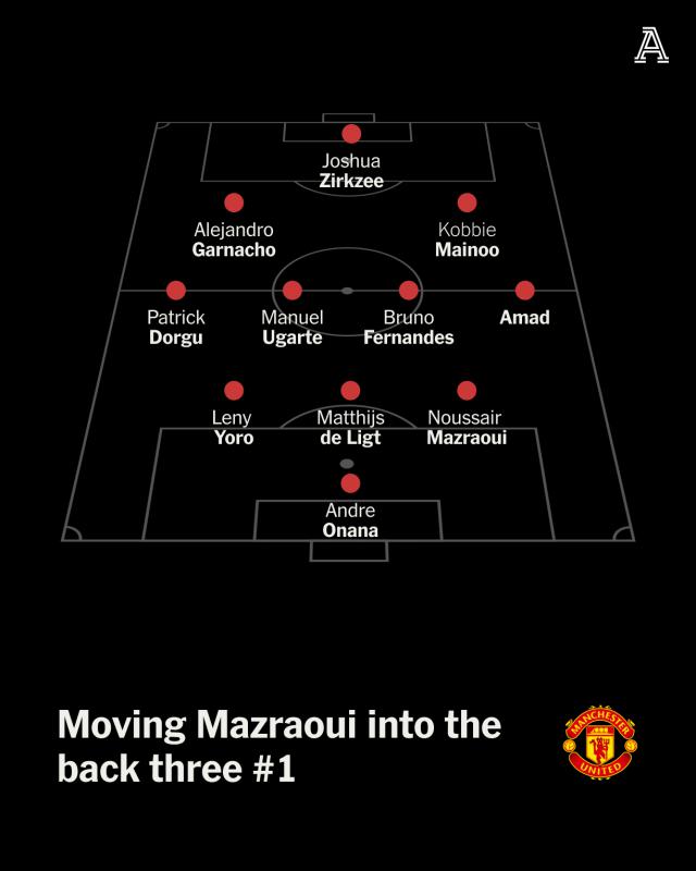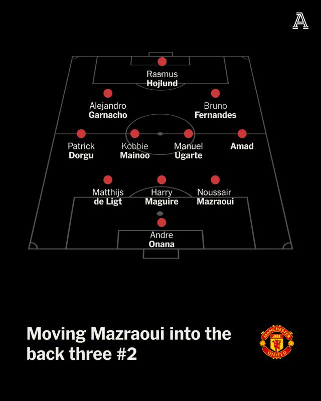 在莱斯特城的足总杯中,阿莫林再一次将马兹拉维放在右中后卫位置,利用他的传球能力和冷静球商。