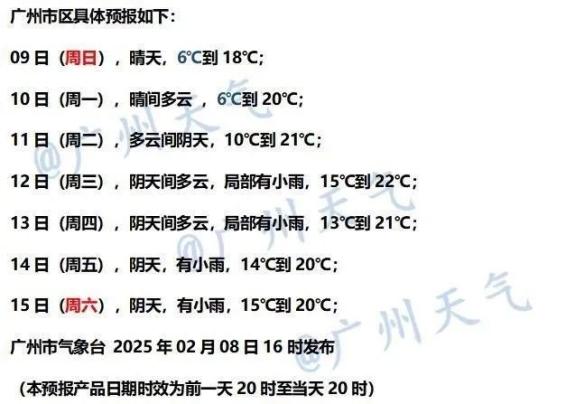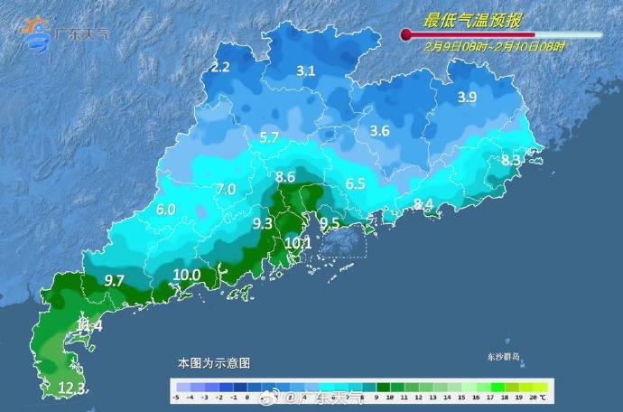 九日,广东大部分市县晴天。早晨最低气温:粤北大部分市县0℃~3℃,高海拔山区零下4℃~零下1℃,珠三角北部及东部,粤东北部3℃~雷州半岛5℃10℃~13℃,其它市县6℃~9℃。