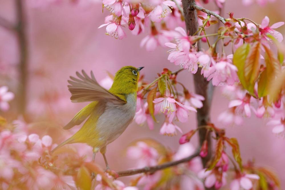二月八日,贵阳街边的冬季樱花盛开,绣眼鸟穿梭于枝叶之间,彰显春天的气息。图片/新华社