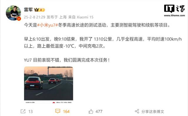 IT 世家 2 月 8 每日消息,小米创始人、董事长兼董事长 CEO 今晚雷军发文透露,今天是小米。 YU7 冬季高速远程试验活动,主要试验智能化驾驶和续航等特色。