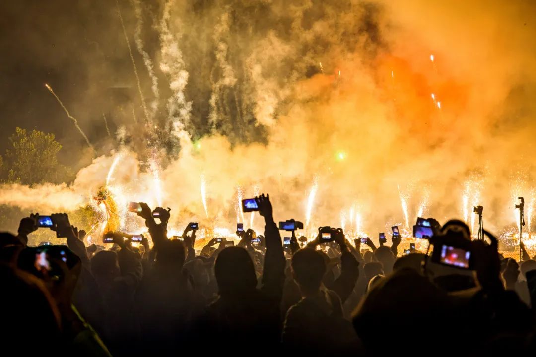 2019年2月19日在广东丰顺浦寨拍摄。广东丰顺浦寨“烧火龙”始于清乾隆六年,以庆祝丰收、迎接新年、风调雨顺、五谷丰登传统广场文化,代代相传,弥漫的烟雾凸显了热烈的节日气氛。照片背光突出了前景的手机自媒体,增加了画面的深度和空间感,增强了画面的张力。