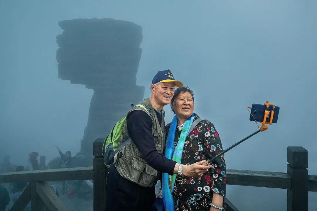 2018年4月11日在贵州梵净山拍摄。雾中,一对老年夫妇在梵净山标志蘑菇石前开心地自拍。两个人的脸上充满了幸福的笑容,他们互相帮助了很多年。“我能想到的最浪漫的事情就是和你一起变老。”老年夫妇的旅行自拍可以记录生活中的每一处风景和笑声。浓雾模糊了背景,降低了陪伴的饱和度,突出了主要人物。