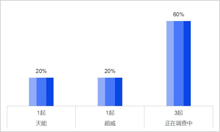 天能、超威品牌各发生一起火灾(共占40%),正在调查中发生3起火灾(比例为60%)。