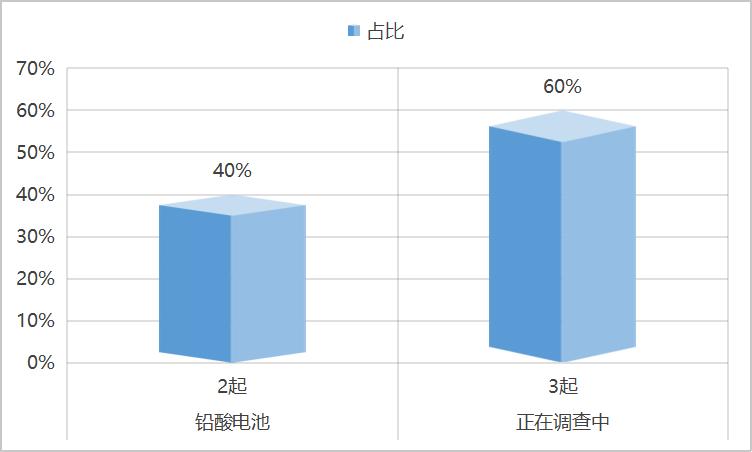 在调查过程中,铅酸电池发生了2起火灾(共占40%),发生了3起火灾(占60%)。