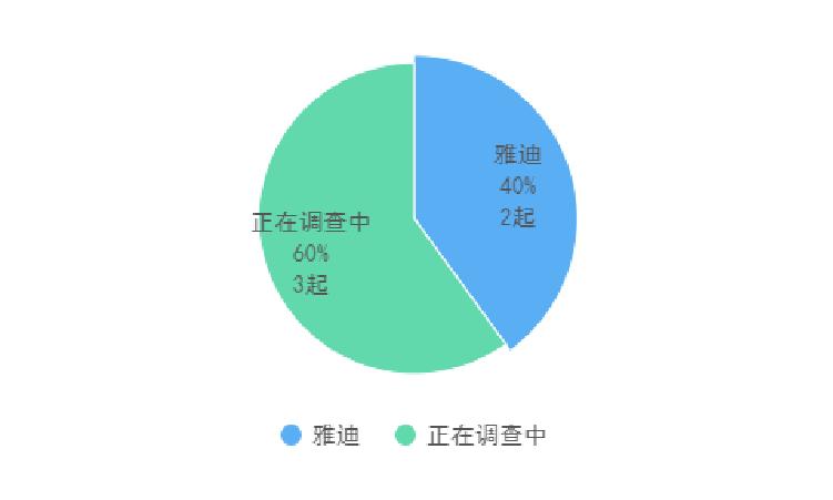 雅迪电动自行车品牌发生2起火灾(占40%),正在调查中发生3起火灾(占60%)。