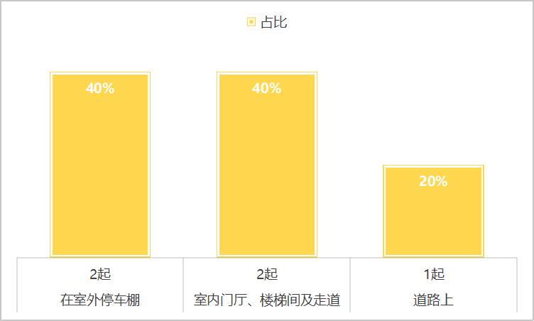 室外停车棚起火2起(占40%),室内门厅、楼梯间、过道起火2起(占40%),道路起火1起(占20%)。