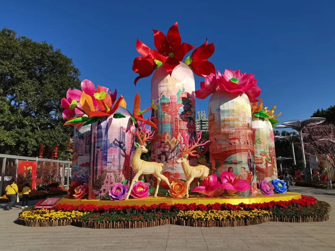 灵感来自大湾区城市建筑和景观的大灯《璀璨的湾区》独特的花瓶造型,上面画着广州、香港、澳门等地的地标,头上挂着红棉、紫荆花、莲花等彩灯。,这意味着大湾区在新的一年里像一朵花一样绽放,前程似锦。