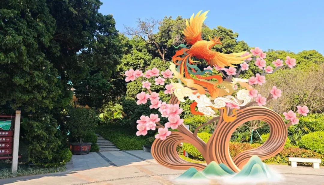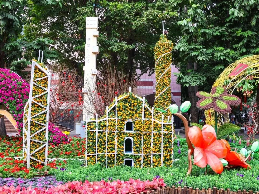 元宵节的一个显著特点是将年花和彩灯完美融合,达到“白天赏花,晚上看灯”的效果。正门中心线景组采用独特的年橘扎作和年花扎作技术,打造了年橘版的“A4腰”广州塔、澳门大三巴牌坊等大湾区地标,以及用矮牵牛花扎作的虹桥造型景区,再用蛇管灯塑造轮廓,达到“彩灯共赏”的效果。